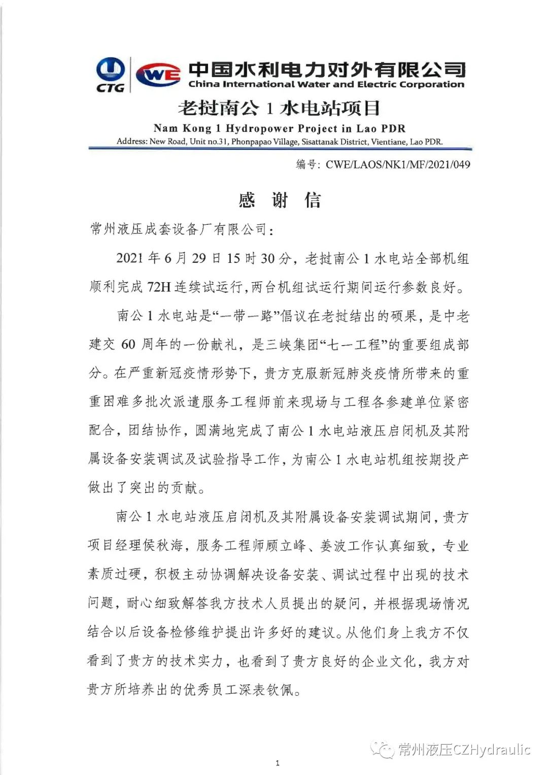 喜迎中國共產黨建黨100周年華誕之際,老撾南公1水電站項目部發來感謝信,感謝常州液壓在疫情防控期間克服重重困難派遣服務工程師指導南公1水電站液壓啟閉機及其附屬設備安裝調試工作,項目經理積極協調解決現場問題,保障了南公1水電站機組按期投產發電!